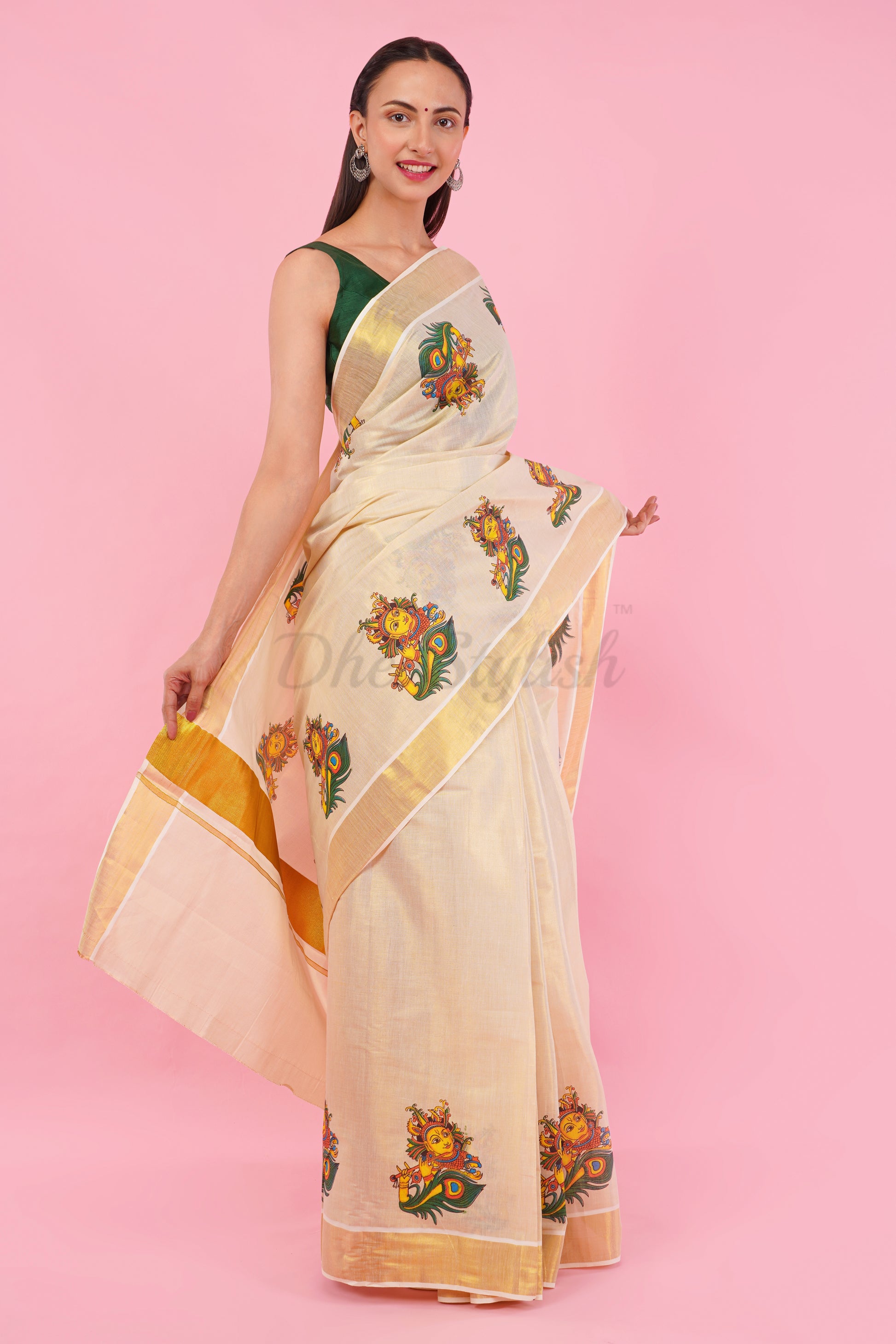 DhevStylish Kerala Kasavu Golden Tissue with Krishna Print Saree with Running Blouse