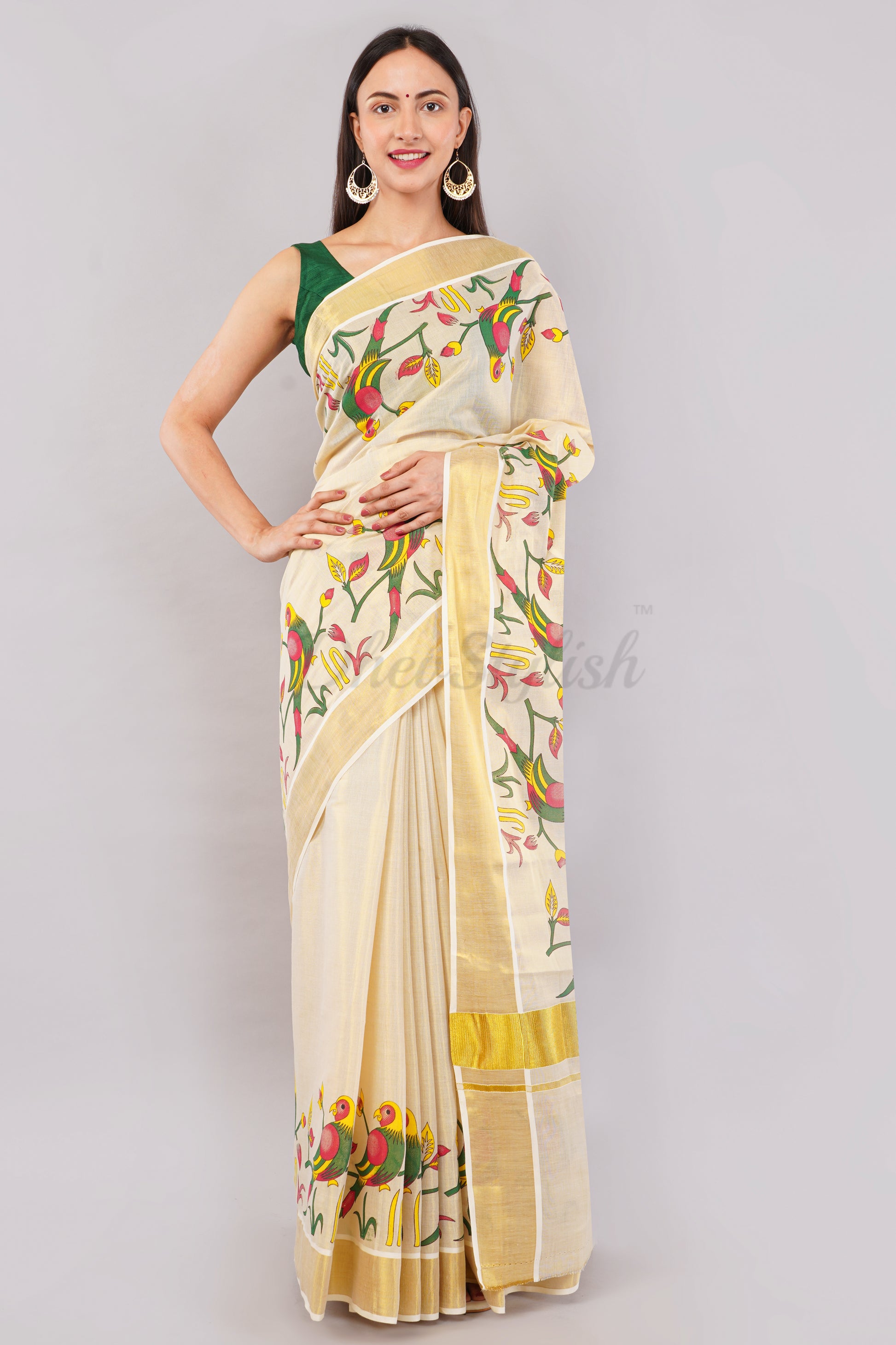 DhevStylish Kerala Kasavu Golden Tissue with Parrot Fancy Design Print Saree with Running Blouse | Green, Red (Blue, Green)