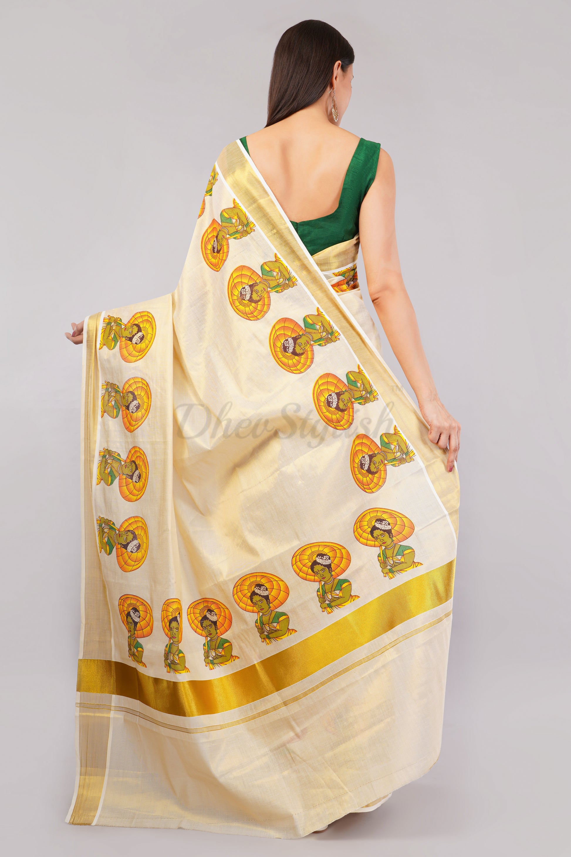 DhevStylish exquisite Kerala Kasavu Tissue Umberlla Women Print Saree for womens with Running Blouse, a timeless piece that embodies the rich tradition and elegance of Kerala. Handcrafted with precision and care, this saree is perfect for the modern woman who appreciates the beauty of traditional Indian attire. Crafted from premium quality pure cotton fabric, our Kerala kasavu saree ensures maximum comfort and durability. With a Saree length of 6.25 meters with Running Blouse, it drapes gracefully, enhancing your natural beauty with every step. Celebrate the festive season with our exclusive Onam Traditional Kerala Kasavu Sarees, designed to capture the essence of Kerala's cultural heritage. Traditional yet stylish, our saree is a must-have for every wardrobe.