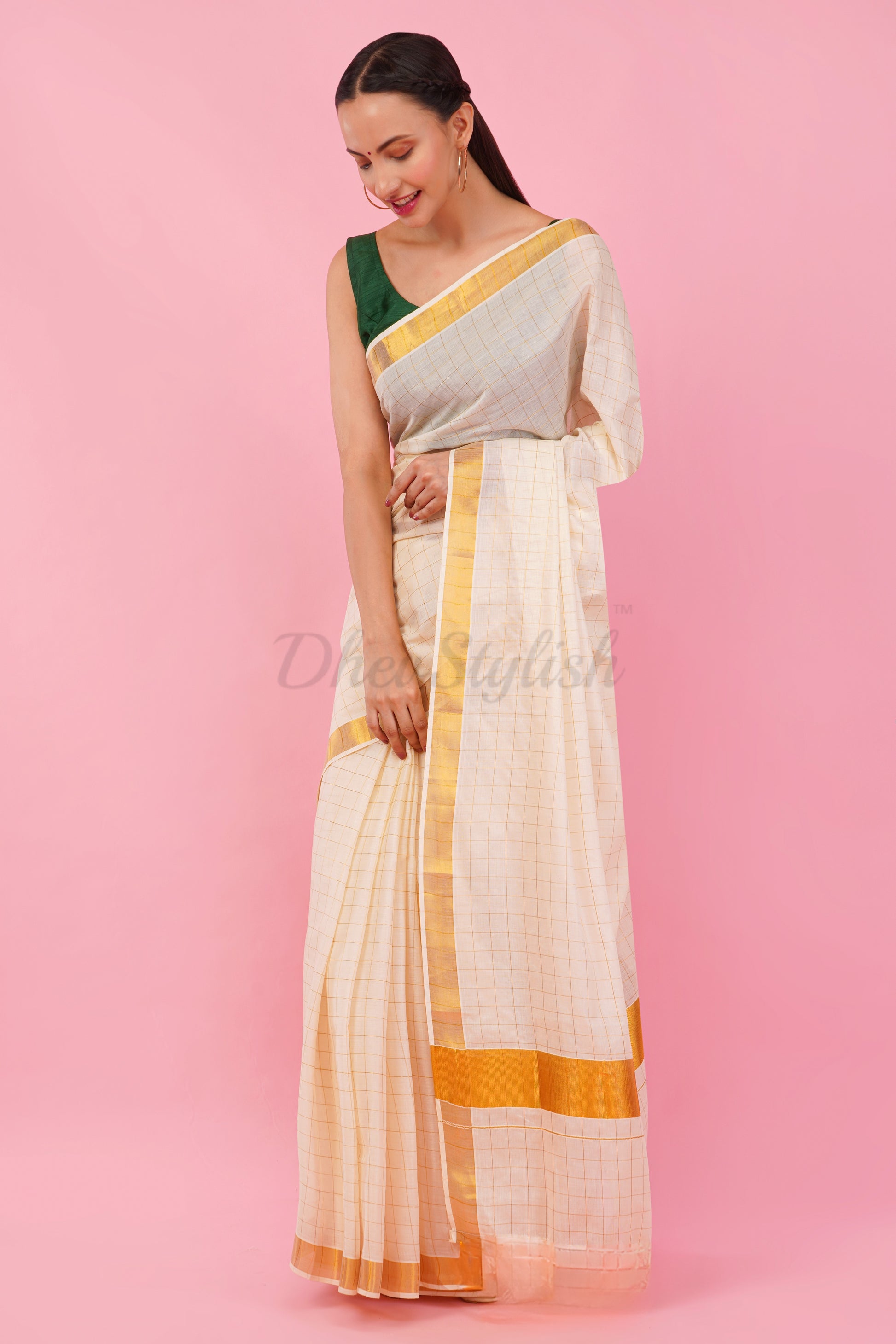 DhevStylish Womens Kerala Golden Checked Plain saree with Running Blouse only